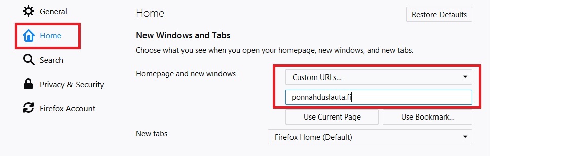 First choose Home from the menu on the left, then Choose Custom URLs... in the box on the right that is marked with red and type ponnahduslauta.fi under it. You are done now and can close the page
